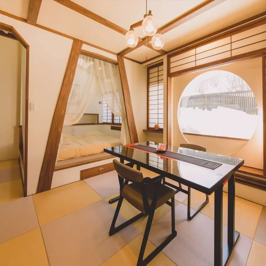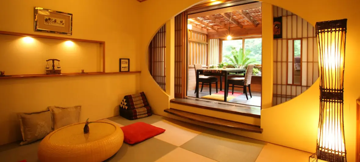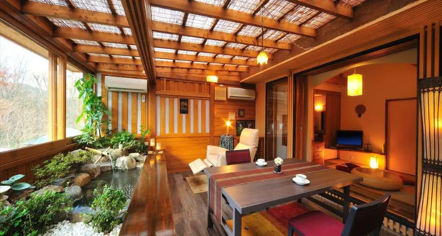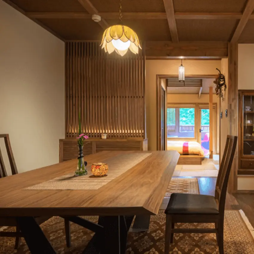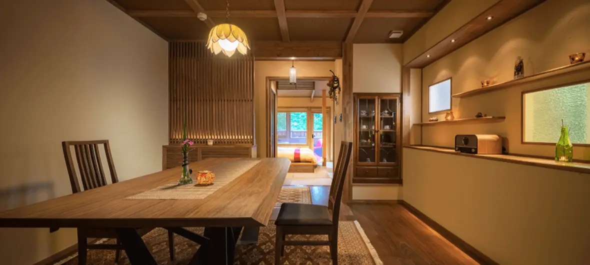 モダンな和室の奥にはコテージ風のテラスが広がり、夜はライトアップされた森を眺めながらランプやキャンドルの灯りでロマンチックなディナーを楽しめます。
