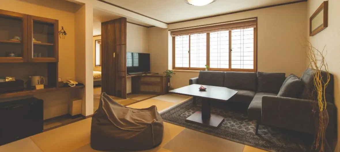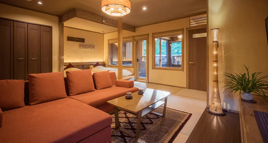 森のデラックスルームは20畳の広々和洋室で、ベッドルームとリビングを備えた大人の寛ぎ空間。