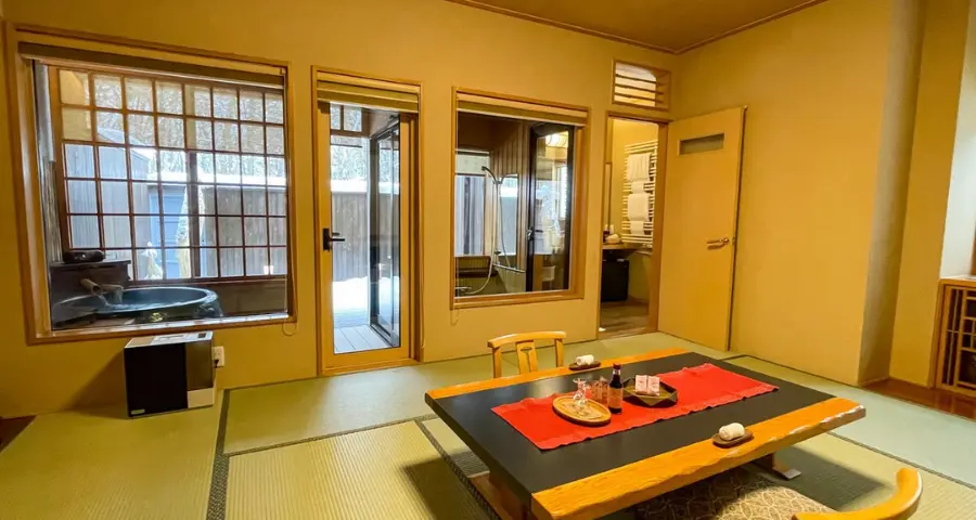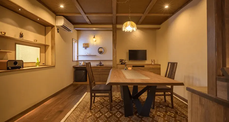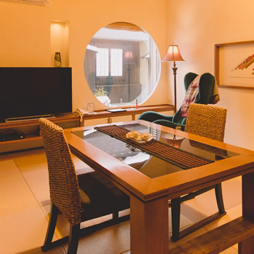 専用ダイニング付きモダン和洋室/信楽焼の客室専用風呂/シャワー・トイレ・陶器洗面台付き/定員2名〜3名様/12畳+専用ダイニング8畳/チェックイン15:00/チェックアウト12:00