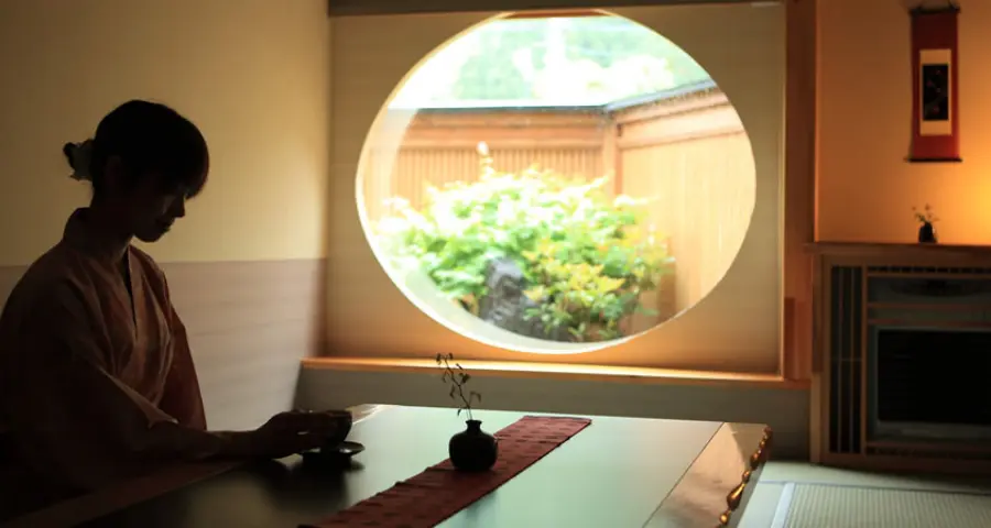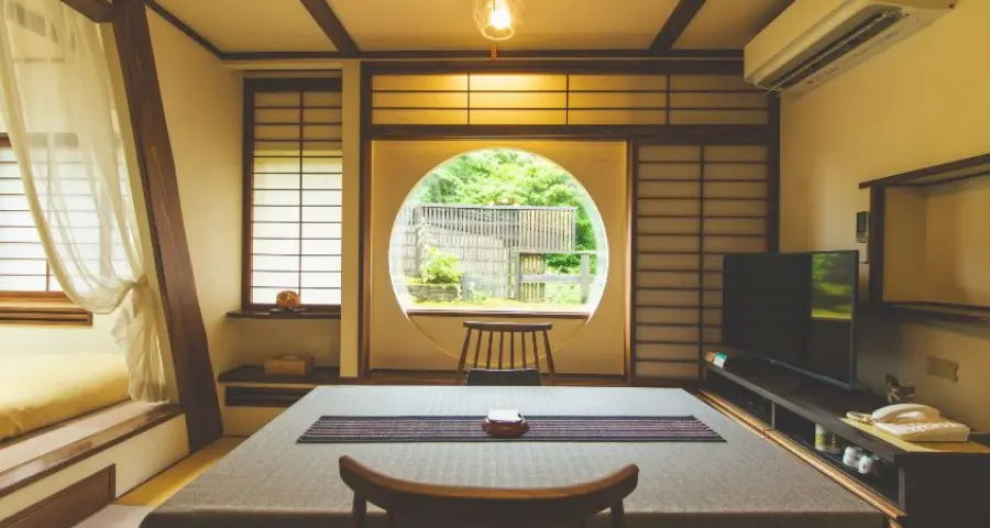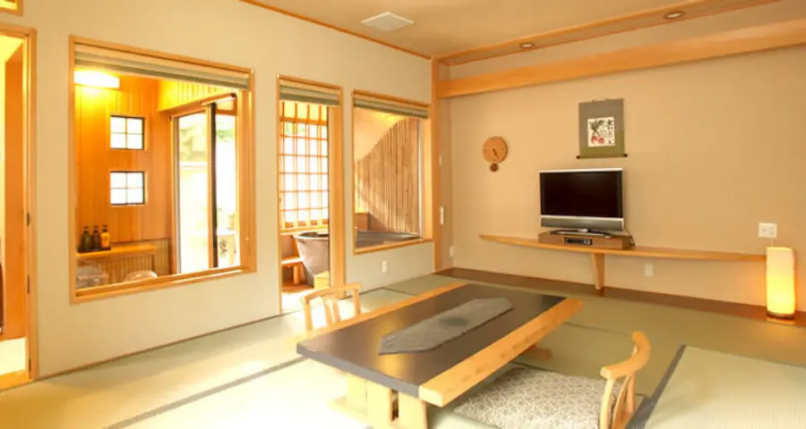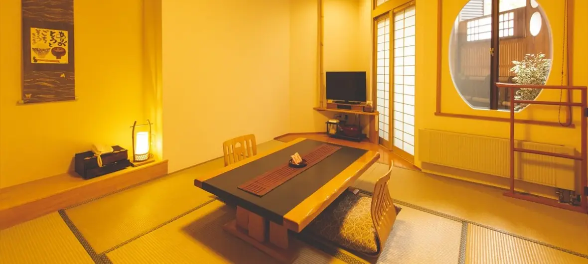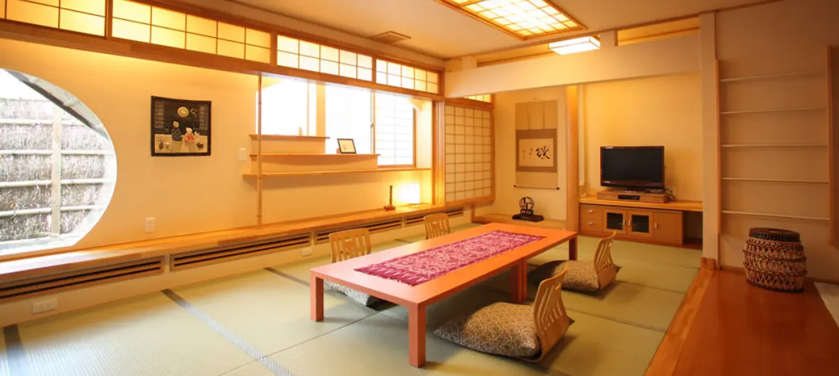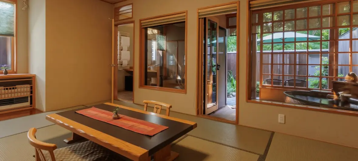 畳敷きのモダン和室/専用窓庭あり/洗面台付き・トイレなし(お部屋の近くに有)/バリアフリータイプ/定員2〜5名様/16畳/チェックイン15:00/チェックアウト11:00