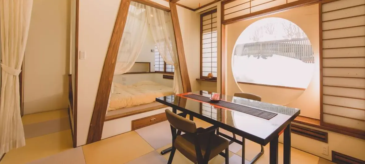 吹抜けの水辺のラウンジを囲む「綿帽子館」の客室は、四季館彩冬のスタンダードクラス。