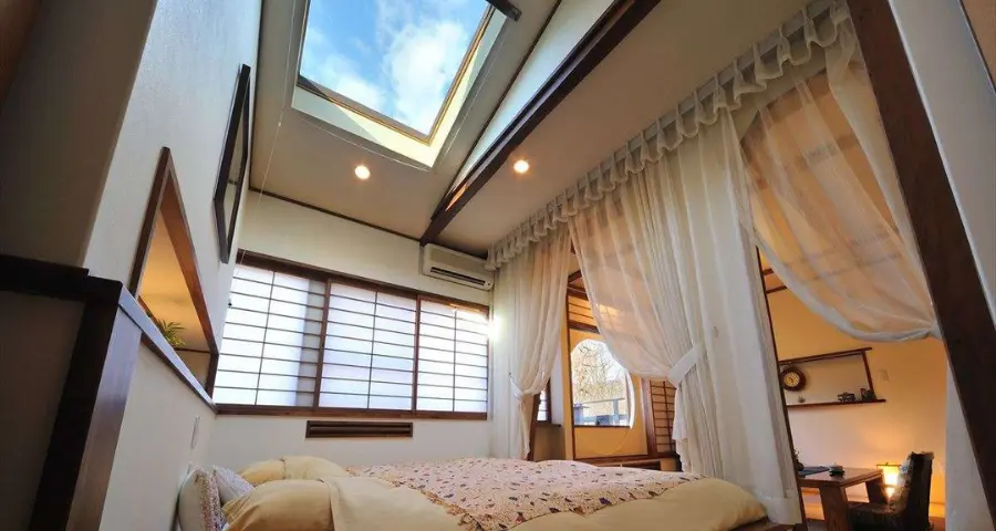 天窓付きモダンスイート/天蓋付ベッドルーム(小上がりにお布団)/専用窓庭付き/陶器洗面台付き・トイレあり/定員2名様のみ/14畳(小上がり3畳)/チェックイン15:00/チェックアウト11:00