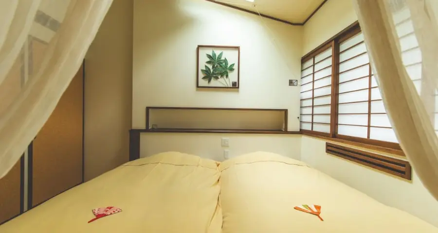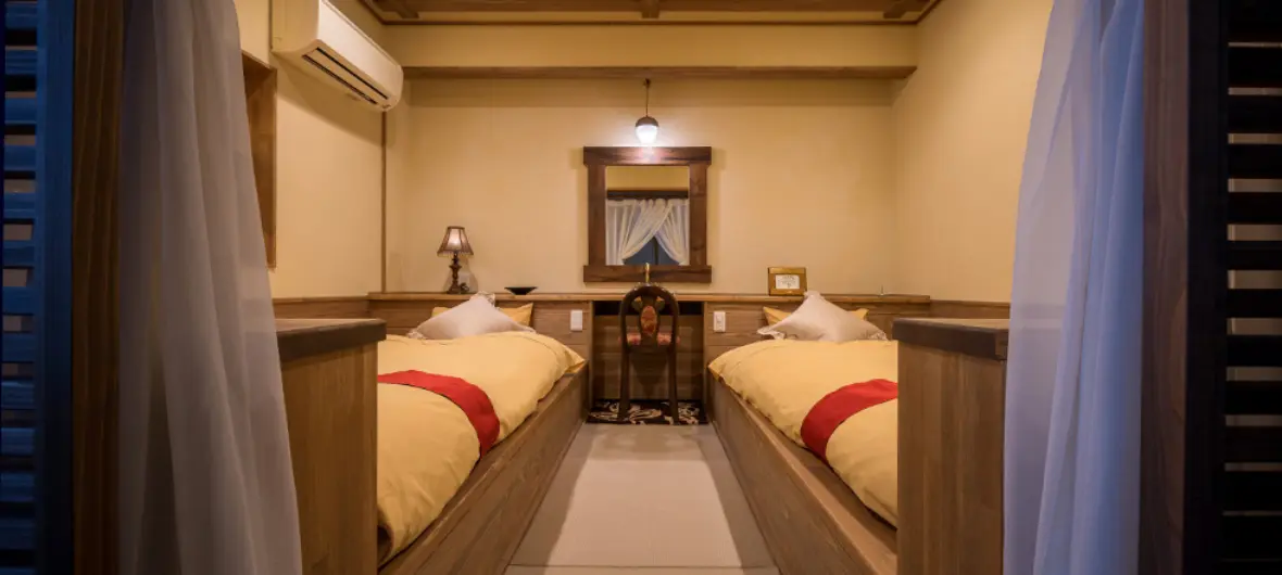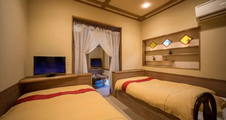 琉球畳のモダンスイート/ベッドルーム(小上がりにお布団)/陶器洗面台付き・トイレあり/マッサージチェア/アロマ&ナノケアイオンスチーマ/定員2名様/16畳(小上がり5畳)/チェックイン15:00/チェックアウト11:00