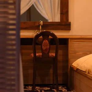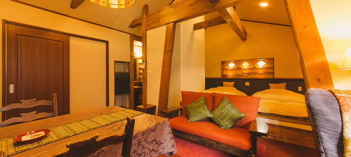 館内唯一の専用ベッドルーム付きスイートは、レトロな山荘風デザイン。