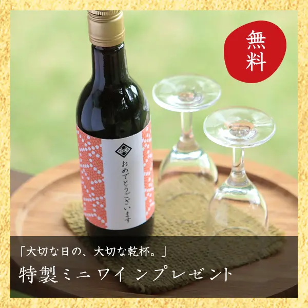 特別な記念日にお泊まりの際は、ご予約時もしくは3日前までにお伝え下さい。 当日もれなく「特製ミニワイン」を1本プレゼント致します。 (チェックイン時お部屋にご用意させていただきます)