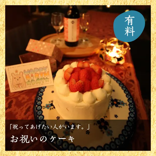 ご希望の場合はケーキの方を手配させていただきます。 (「お祝いのケーキ」3号・¥3,300〜 ※ご注文はご予約時もしくは3日前までにお願いいたします。) ・夕食後のデザートとご一緒にお持ち致します。 (希望のタイミングがある方はお申し付け下さい)