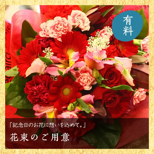 ※「記念日のオプションサービス」は予約時もしくは3日前までににお申し込みいただいたお客様へのサービスです。 ワインプレゼント・ケーキ・花束は当日での手配はできかねますのでご了承下さい。